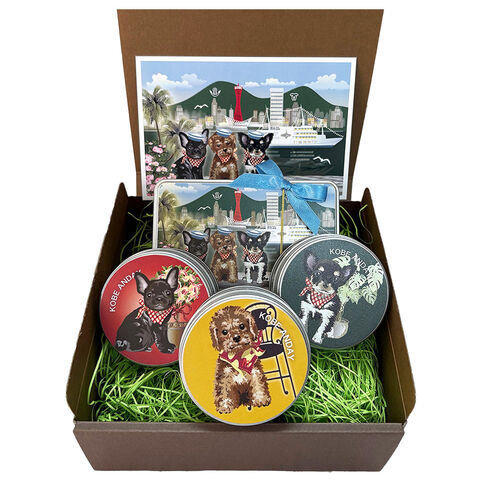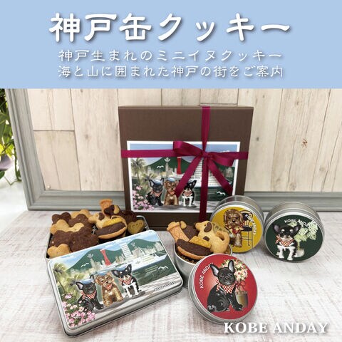 神戸アンディの「クッキー缶セット 3匹犬柄」です。クッキーが入った3種類の缶(角缶1個、丸缶3個)とポストカードのセットでお届けします。神戸生まれのアンディのワンちゃんが、大好きな神戸の海・山・街を案内します。化粧箱に入れてお届けしますので、犬が好きな方へのギフトやプレゼントなどにもご利用ください。