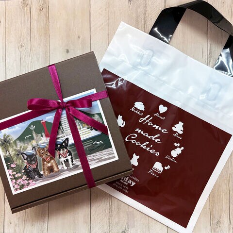 【数量・内容】角缶(アーモンドクッキー×8、ミニクッキー×3、ミニ犬クッキー×2)×1、丸缶(ミニクッキー×3、ミニ犬クッキー×2)×3、ポストカード×1