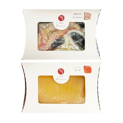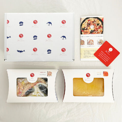 【数量・内容】パエリア具340g(有頭えび、いか、ムール貝、調味料)、パエリアスープ500g