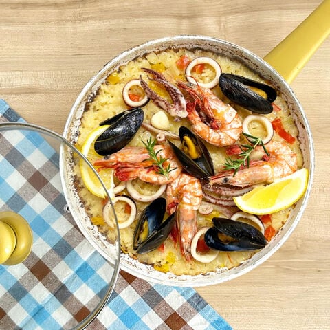 【原材料】<パエリア具>えび(インドネシア産)、ボイルムール貝(ムール貝(カナダ産))、いか(石川県)、食用オリーブ油、白ワイン、ニンニク、ハーブ&スパイスミックス調味料