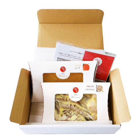 ご家庭で生米2合、バター、玉ねぎ、お好みの野菜をご準備ください。調理セットを解凍後、中身をすべてフライパンに入れて炒めれば本格パエリアが完成です。作り方のレシピをつけてお届けします。