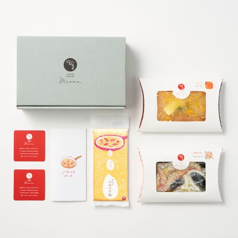 「Manma 有頭えびのパエリア ミールキット ギフト」は、たっぷりの魚介類、玉ねぎとパプリカなどの野菜の入った特製のスープ、パエリア専用米のセットです。有頭えび、いか、ムール貝の3種の厳選した海鮮をオリーブオイル、白ワイン、スパイス調味料などで味付けして冷凍しています。下処理もしていますので、解凍後そのままフライパンに入れて炒めてください。スープも解凍してそのままお使いいただけます。まんまパエリア米には、山形県産「雪若丸(ゆきわかまる)」を使用。パエリア専用のお米としてオリジナルパッケージ(2合用/3~4人前)にしました。パエリアやリゾットなど、スープを吸わせて調理するのに適したお米です。(賞味期限は未記載で産年および精米年月日を印字しております。冷凍保存しておりますので使用時に冷凍庫から取り出し、冷凍のまま袋を開けてご使用ください。)