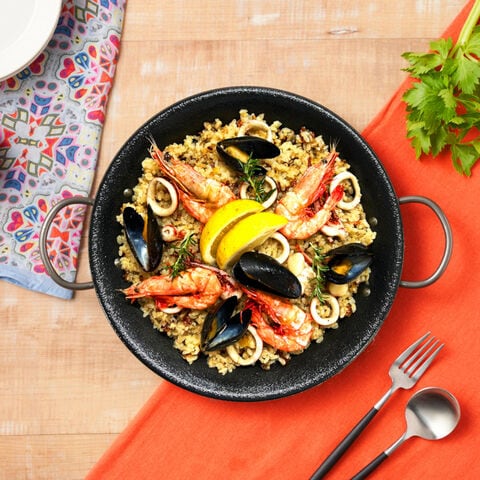 【原材料】<パエリア具>えび(インドネシア産)、ボイルムール貝(ムール貝(カナダ産))、いか(国産)、食用オリーブ油、白ワイン、ニンニク、ハーブ&スパイスミックス調味料