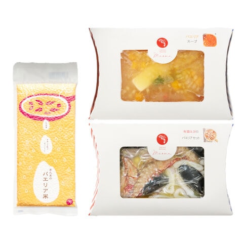 【数量・内容】パエリア具340g(有頭えび、いか、ムール貝、調味料)、パエリアスープ630g、パエリア専用米300g