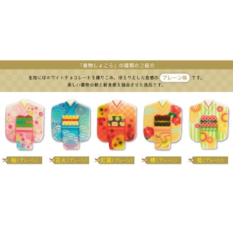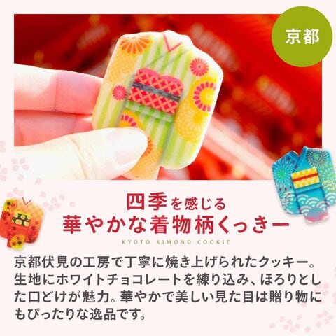 日本を代表する花をパステルカラーの着物で表現したクッキーです。桜の花、花火、紅葉、椿や菊の花が美しく描かれています。かわいい見た目だけでなく、味にもこだわり、生地にホワイトチョコレートを練り込んでほろりとした食感に仕上げました。 「しょこらくっきー」シリーズは丁寧に焼き上げたオリジナルの味と食感が人気です。見た目もかわいくて美しいデザインが魅力のチョコレートクッキーです。着物しょこらくっきーは、華やかな着物の柄で見ていて飽きません。目でも楽しめる一品です。京都伏見の工房でひとつずつ丁寧に焼き上げてお届けします。かわいい箱にひとつずつ個包装のクッキーが入っています。京都のお土産に、プチギフト、ご褒美スイーツ、お茶請けに、かわいくて美味しいクッキーはいかがでしょうか。