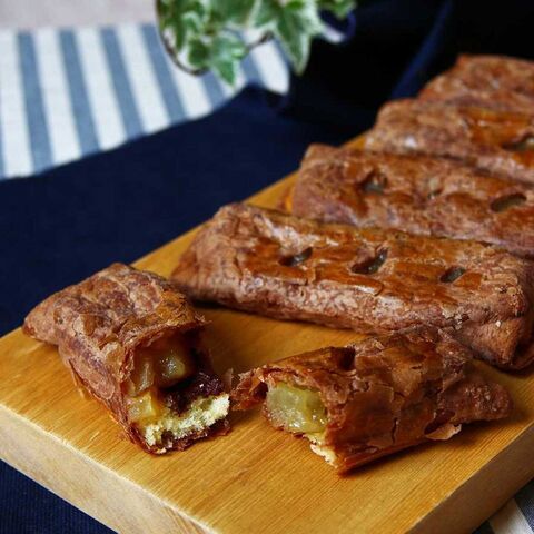 【原材料】リンゴシロップ漬(リンゴ:青森県産)、ココアパイ、小麦粉、液鶏卵、チョコレート、砂糖、マーガリン(乳成分を含む)、麦芽糖、水あめ、食用加工油脂、米粉、でん粉、シナモン/加工デンプン、糊料(加工デンプン、キサンタンガム)、香料、乳化剤(大豆由来)、酸味料、酸化防止剤(V.C、V.E)、膨張剤、乳酸Ca、pH調整剤、クエン酸、着色料(カロチン)