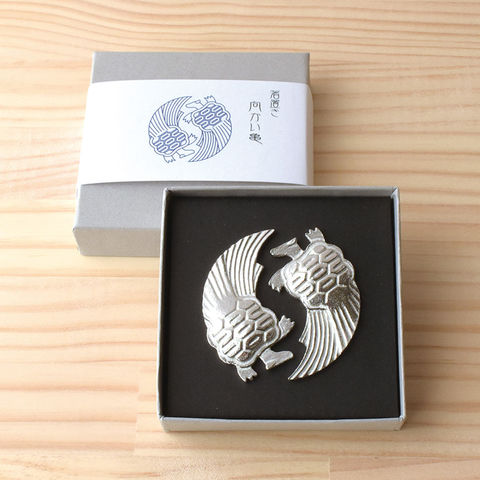 竹中銅器の「錫箸置き 向かい亀」です。日本の伝統的な文様で、縁起の良い亀をモチーフにした箸置きです。亀は「鶴は千年、亀は万年」とも言われるとおり、長寿や吉祥の象徴として慶事の会席をはじめ、ご家庭でのお祝いの食卓を演出します。素材の錫は柔らかい金属なので、手で曲げて形を変えることができます。鶴の翼や首を軽く上向きに曲げていただくと、形が華やかになり、お箸も転がりにくくなります。 錫は酸化しにくく、水の中に浸すと錫イオンによって水が腐りにくくなります。そのため箸置き以外の使い方として、水盤や透明な花器の中に飾れば活けたお花を長持ちさせることができます。また、首と翼との隙間を利用し、メッセージカードや席札を立てることができます。大切な方とのコミュニケーションや、お祝いの席の演出にご活用いただけます。
