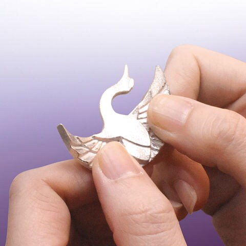竹中銅器の「錫箸置き 長寿鶴亀」です。日本の伝統的な文様で、縁起の良い鶴亀をモチーフにした箸置きです。「鶴は千年、亀は万年」とも言われるとおり、長寿や吉祥の象徴として慶事の会席をはじめ、ご家庭でのお祝いの食卓を演出します。素材の錫は柔らかい金属なので、手で曲げて形を変えることができます。鶴の翼や首を軽く上向きに曲げていただくと、形が華やかになり、お箸も転がりにくくなります。 錫は酸化しにくく、水の中に浸すと錫イオンによって水が腐りにくくなりますので、箸置き以外の使い方として、水盤や透明な花器の中に飾れば、活けたお花を長持ちさせることができます。また、首と翼との隙間を利用し、メッセージカードや席札を立てることができます。大切な方とのコミュニケーションや、お祝いの席の演出にご活用いただけます。