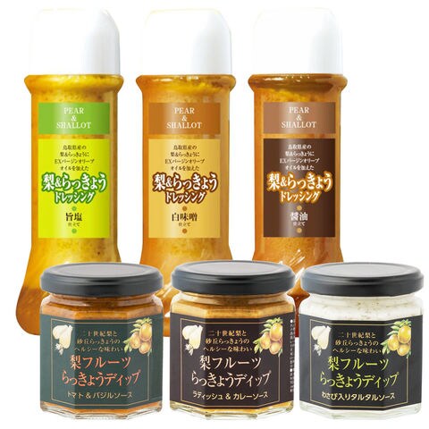 鳥取県産の梨とらっきょうを満喫できる「梨とらっきょうで作ったディップソース・梨ドレ」詰合せセットです。梨とらっきょうの旨みを凝縮し、ご家庭で簡単にプロの味が楽しめるディップソース3種類(わさび入りタルタルソース・トマト&バジルソース・ラディッシュ&カレーソース)と、素材の持ち味を活かしたフルーツ感味わえるヘルシードレッシング3種類(旨塩仕立て・白味噌仕立て・醤油仕立て)を詰め合わせました。鳥取名産品ギフトとして贈り物にもおすすめです。二十世紀梨とらっきょうが織りなす味わいをお楽しみください。