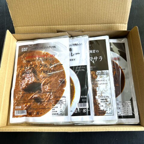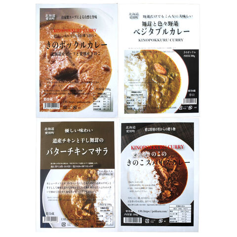 【数量・内容】きのポックルカレー(北海道産ビーフと愛別産きのこ)200g、ベジタブルカレー(舞茸と色々野菜)200g、バターチキンマサラ(道産チキンと干し舞茸)180g、きのこスパイスカレー180g