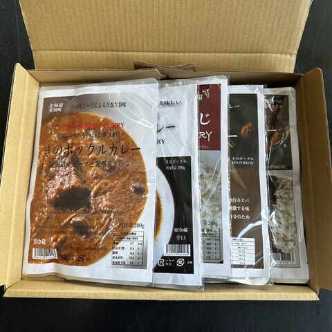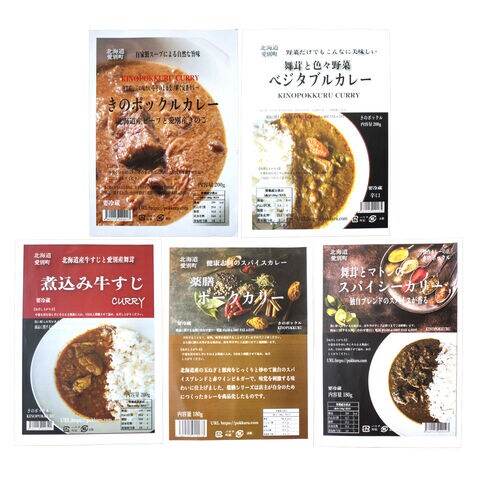 【数量・内容】きのポックルカレー(北海道産ビーフと愛別産きのこ)200g、ベジタブルカリー(舞茸と色々野菜)200g、煮込み牛すじカレー200g、薬膳ポークカリー180g、舞茸とマトンのスパイシーカリー180g