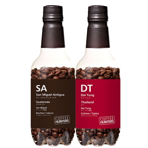 ミカフェートのコーヒー「コーヒー豆 コーヒーハンターズ 2種セット」です。 「COFFEE HUNTERS(コーヒーハンターズ)」は、市場に紹介されていない珍しい栽培種や独自の栽培、精選方法で品質を高めている農園のコーヒーをラインナップしたシリーズです。 同シリーズの中から、おすすめの2銘柄をセレクトしました。 コーヒー豆はペットボトル入り、コーヒーのアロマを維持したままお届けするために、ハイバリアペットボトルを使用した独自の加圧包装です。 【サンミゲル アンティグア】在来種「ブルボン」とブルボンからの突然変異種「カトゥーラ」の絶妙なバランスの取れた本銘柄は、サン ミゲル農園ならではの濃密なカカオを彷彿とさせるフレーバーと、みずみずしい柑橘類の酸が印象的で、強い味わいと透明感のある複雑な余韻がどこまでも続くコーヒーです。 【ドイトゥン】全体的にまろやかで、ミネラルが感じられる、すっきりとした後味が特徴です。仕事の合間など、ほっとしたいひと時に最適な味わいのコーヒーです。 【ミカフェート】スペイン語で”私のコーヒーの樹”を意味するこの名前には、お客様ひとりひとりに”私の”と思っていただけるコーヒーの樹を一本でも多く育てようという熱い想いが込められています。