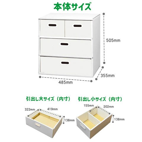 【数量・内容】【サイズ】本体:幅48.5cm×奥行35.5cm×高さ50.5cm、引き出し大(内寸):幅41.9cm×奥行32.2cm×高さ13.8cm)×2、引き出し小(内寸):幅20.2cm×奥行32.2cm×高さ13.8cm)×2