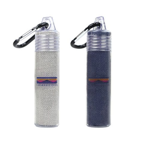 【数量・内容】カラビナ付専用ケース入りウェットタオル(グレー、ネイビー) 各1 サイズ:タオル約25cm×30cm、ケース約直径3.5cm×高さ16cm
