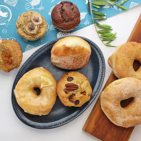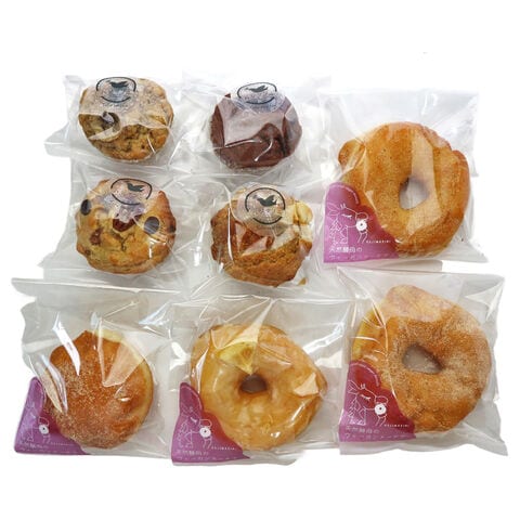 【数量・内容】マフィン(バナナメープル90g、ナッツキャラメル90g、瀬戸内柑橘ジャム&アールグレイ90g、オーガニックココア90g)、ドーナツ(プレーン65g、シナモン65g、島レモングレイズ65g、SOYカスタード80g)