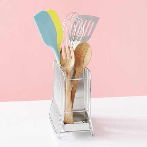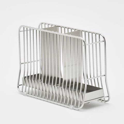 「ツールスタンド Lサイズ シルバー」は、菜箸、フライ返し、泡立て器、木べらなどのキッチンツールを立てるのに便利なスタンドです。調理小物をまとめて収納することで、キッチンを広々と使えます。薄型の美しいフォルムはアクセサリーのようなデザインです。