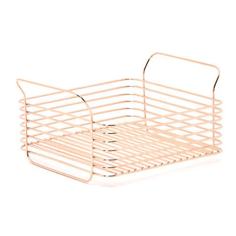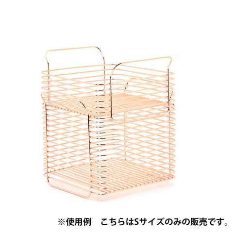 「キッチンバスケット Sサイズ ローズゴールド」は、パン、ジャム、フルーツ、お菓子など、毎日の定番モノをスッキリとまとめられるおしゃれなステンレス製のワイヤーバスケットです。本体上部に取っ手が付いており、移動や持ち運びの際に便利です。キッチンから食卓へもラクに運べます。別売りのLサイズを重ねて使用することも可能です。