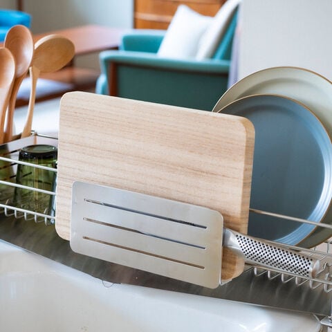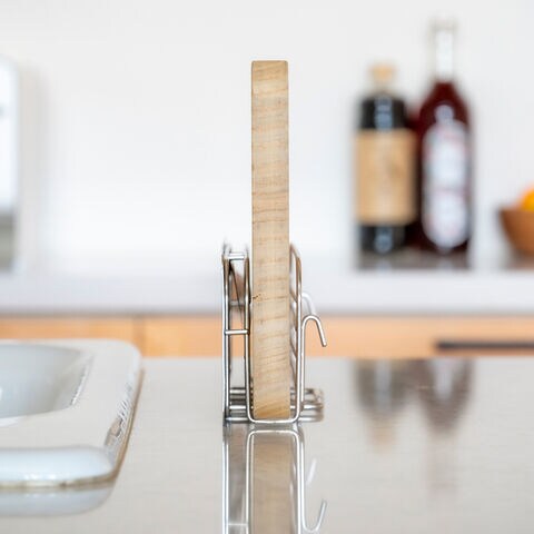 「包丁&まな板スタンド」は、キッチンのカウンタートップなどに置いて、包丁やまな板をスマートに収納できるシンプルなデザインのスタンドです。横から抜き差しするタイプなので出し入れがしやすく、使いやすいです。そのまま置いて使うだけでなく、背面のフックでUtaUの水切りラックにピタッと設置できます。厚さ2cmまでのまな板に対応しています。横から見てもスリム設計なので、スペースの少ないキッチンでも場所を取らずにスッキリ収納できます。