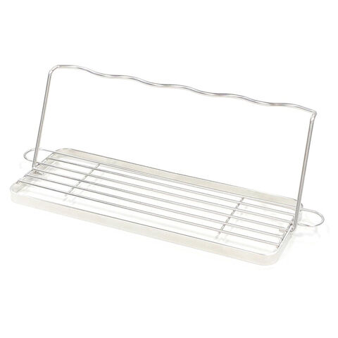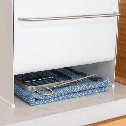 折り畳むと高さ2.3cmほどになる薄型設計です。引っ掛け収納も可能なので、収納スペースに困りません。燕三条製の丈夫でサビに強い18-8ステンレスのスタンドです。食器洗浄機に対応しており、お手入れも簡単です。