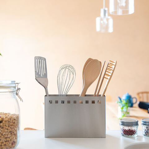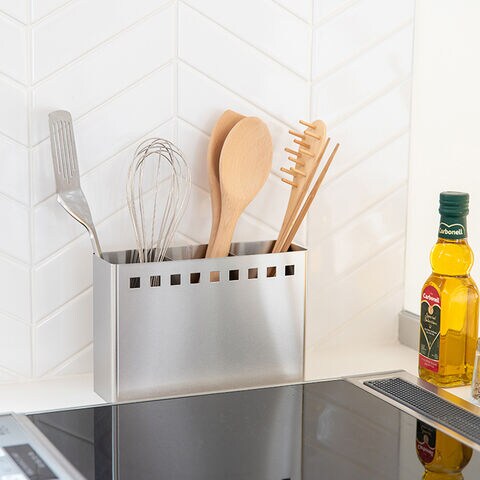「キッチンツールスタンド ワイド」は、シンプルなデザインながら、便利な仕切り付きで3か所に分けてお好みの場所にキッチンツールを保管できるスタンドです。サビにも強いステンレス製のボディは高さ約15cm、重量約750gのちょうどいいサイズと重さ。先の大きなお玉やヘラなど色々なツールもしっかり収納できます。仕切りは底板と一体型で取り外して丸洗いもOKです。底板に敷いて使うクッションゴムは、滑り止めやツールを入れた時の音の軽減、ツールの保護に役立ちます。