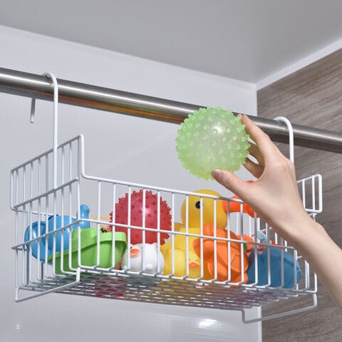 「お風呂用 おもちゃバスケット ワイドタイプ ホワイト」は、子どものおもちゃのほか、シャンプーボトルや洗顔フォームなどのお風呂グッズをすっきり収納できるスチール製のバスケットです。表面には滑らか加工処理がほどこされており、サビにも強いのも特徴です。使いやすさを考えた大きめの取り出し口は、前からでも後ろからでもラクに出し入れできます。横の網目は中身を見やすいサイズに設計、底はしっかりしたつくりの細かい網目で物が落ちにくいです。