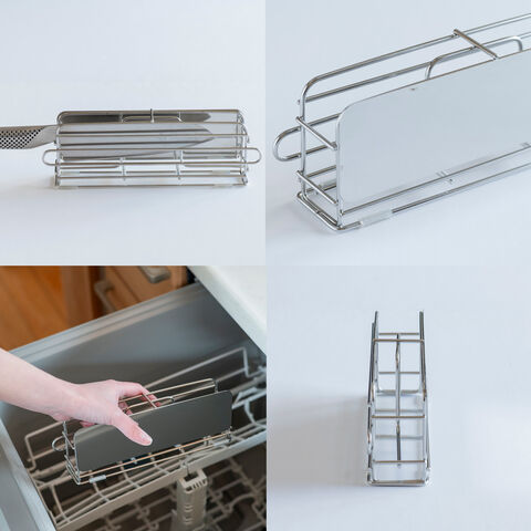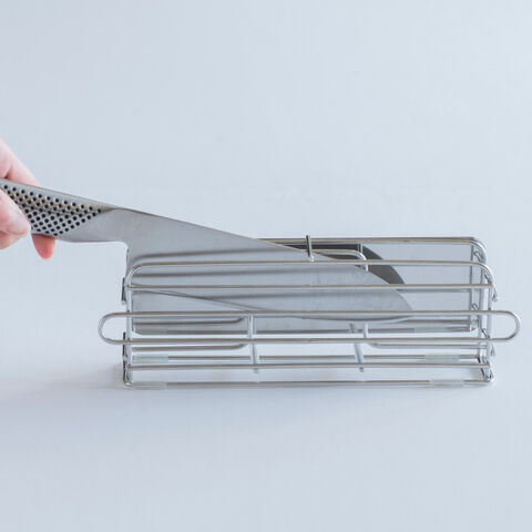 高さ約8cmとコンパクトなので食器棚や引き出しにそのまま収納できます。包丁を入れていない時は引っ掛け収納も可能です。水切りの際は吸水タオルや吸水マットなどを下に敷いてお使いください。そのまま置いても包丁の刃が見えないように片面はステンレスの板でカバーしています。すっきり暮らすシリーズの水切りと一緒に置いても使いやすいサイズ。燕三条製の丈夫でサビに強い18-8ステンレス製。食器洗浄機対応で丸洗い可能です。