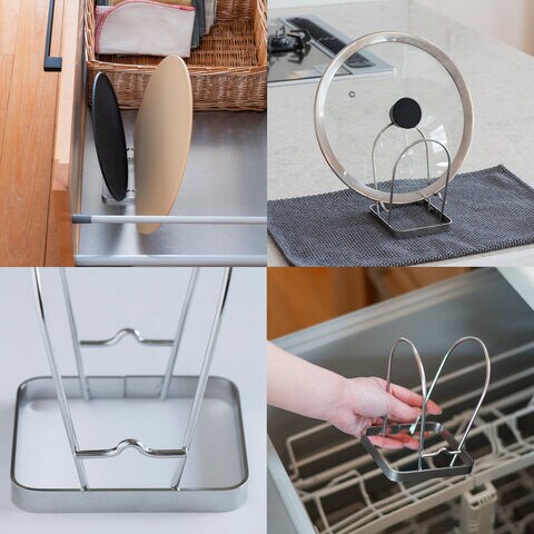 bws SELECTIONの「すっきり暮らすまな板スタンド」です。洗った後のまな板の置き場所に便利な、コンパクトでシンプルなフォルムのまな板スタンド。洗った後のまな板を水切りかごに入れてしまうと場所を取られがちで、特に丸型のまな板は安定しにくいのが難点。横ワイヤーにより、そんな丸型のまな板も下に付かずに、浮かせて衛生的に乾かせる便利なスタンドです。幅約30cm、厚さ約1.5cmまでのまな板を2枚収納可能。V字型に置く事でまな板同士がくっつかずに乾きやすい構造です。丸型のほか、長方形、かまぼこ型、カッティングボードなどの様々な形のまな板に対応します。水切りの際は吸水タオルや吸水マットなどを下に敷いてお使いください。