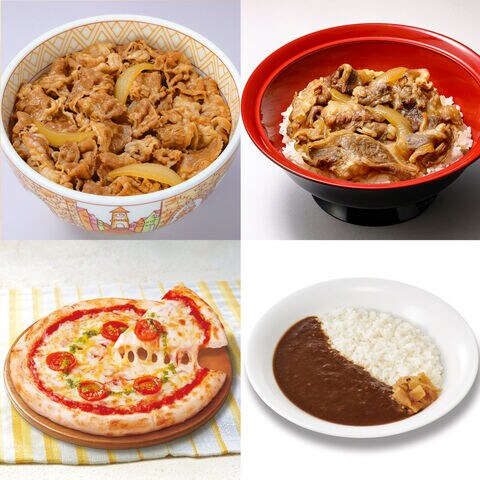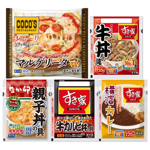 【数量・内容】すき家牛丼の具120g、すき家牛カルビ丼の具120g、すき家横濱カレー220g、なか卯親子丼の具145g、ココス監修チェリートマトと3種チーズのピッツァマルゲリータ215g 各8