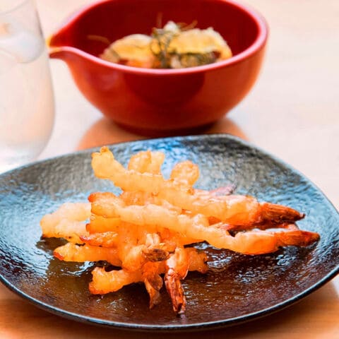 <旨みたっぷりえびの炙り焼>甘辛く味付し、焼き上げたえびの風味と香ばしい味わいがクセになる逸品。日本酒、ビール、ウイスキー、白ワインと好相性。