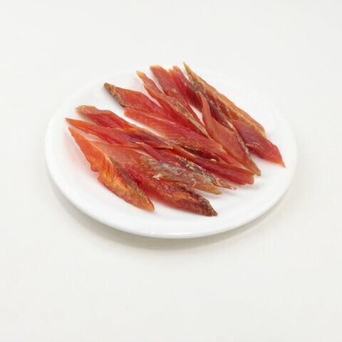 <皮むきひとくち鮭とば>鮭の旨味を凝縮した食べ応えのある味わいと、噛みごたえのある食感がクセになります。