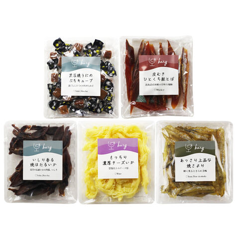 「北陸 小さなおつまみ専門店 bary 海鮮 おつまみセット」は、ホクチンのおつまみブランド”bary(バリー)シリーズ”の珍味5種の詰め合わせです。
