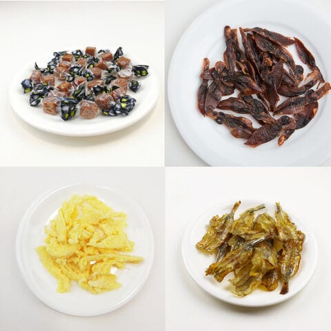 【数量・内容】濃厚焼うにのぷちキューブ35g(個包装紙含む)、皮むきひとくち鮭とば28g、いしり香る焼ほたるいか20g、もっちり濃厚チーズいか45g、あっさり上品な焼さより32g