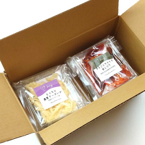 <もっちり濃厚チーズいか>いか(ペルー産)、砂糖、食塩、食用植物油脂、醸造酢、チーズ、きび砂糖、還元でん粉糖化物、デキストリン、還元麦芽糖水あめ、乳糖、乳たん白、酵母エキス、植物たん白加水分解物/ソルビトール、調味料(アミノ酸等)、酸味料、グリセリン、リン酸塩(Na)、乳化剤、香料、甘味料(カンゾウ、ステビア)、カロチノイド色素、(一部に乳成分・いか・大豆を含む)