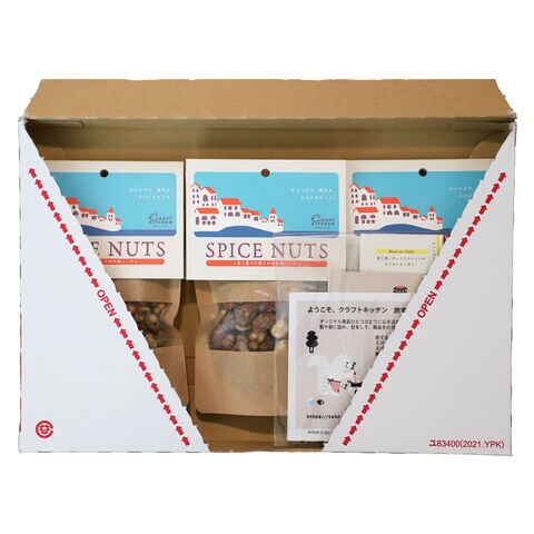 【原材料】アーモンド(アメリカ産)、くるみ、大豆(北海道産)、へーゼルナッツ、鶏卵、甜菜糖(北海道製造)、食塩、混合スパイス(地中海ハーブスパイスミックス(内製))、ピンクペッパー、ガーリック、黒胡椒、ラベンダー