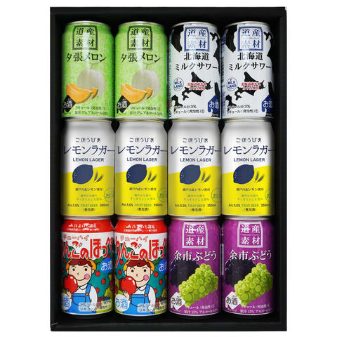 【数量・内容】余市 りんごのほっぺ350ml×2、道産素材 夕張メロン350ml×2、道産素材 余市ぶどう350ml×2、 道産素材 北海道ミルクサワ-350ml×2、ごほうびあ レモンラガ-350ml×4