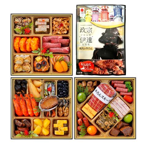 牛たん専門店”利久(りきゅう)”自慢の牛たん料理などをお重に盛り込んだ「牛たん炭焼 利久 和洋中おせち 三段重 亀 牛たん塩味付き」です。別添品として、牛たん真空パックが1パックが付いおり、牛たんの魅力を前面に押し出したおせちに仕上げました。その他にもお客様からのご要望にお応えし、和洋中のメニューを配置したことで、幅広い世代にお楽しみいただける品揃えに。新春の晴れやかな食卓を華やかに彩ります。