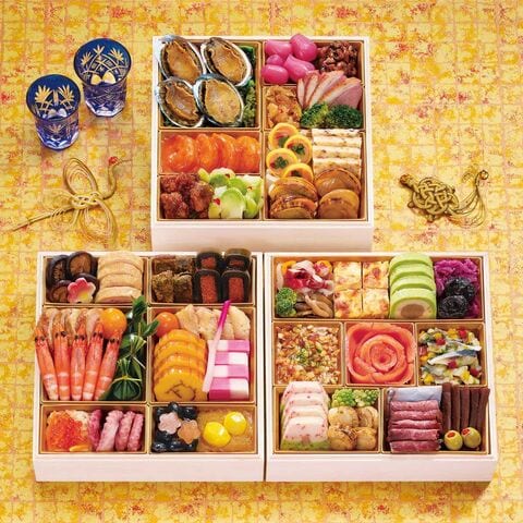 梅麩含め煮、椎茸旨煮、かに信田、鮎土佐煮、鱈子昆布巻、鶏肉八幡巻、牛しぐれ笹包み、祝海老、金柑、赤魚西京焼、伊達巻、はじかみ、市松かまぼこ、なます いくら添え、蛸旨煮、梅型寒天、黒豆、栗金団