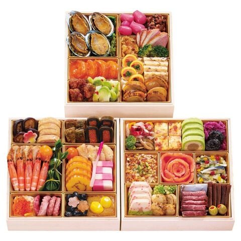 歴史と伝統に培われた”ハイアット リージェンシー 東京”の総料理長 星野勝明監修による彩り豊かな「和洋中おせち 三段重 香宝(こうほう)」です。日本料理・西洋料理・中国料理それぞれの素材を吟味し、伝統の調理技術とホテル監修ならではの質の高いお料理を、優雅に盛り付けました。海老チリのソースは料理長直伝のオリジナルソースです。素材の良さを引き出し、手を掛けて丹精込めた料理の数々。急速冷凍技術により、格別の美味しさを実現いたしました。一度解凍したお料理は再冷凍せず、お早めにお召し上がりください。