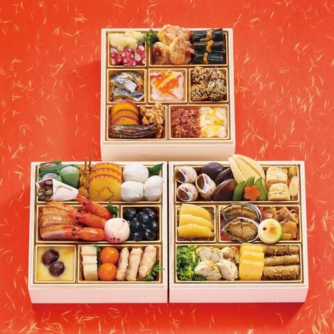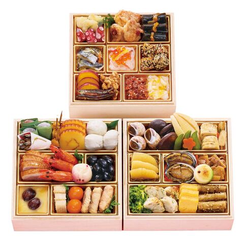 京壬生菜と柚子のちぎり天、梅酢たこ、赤魚南蛮漬、一口昆布巻、にしん親子甘酢漬、いくら醤油漬、京なま酢、紅はるか胡麻まぶし、さつま芋レモン煮、くるみ甘炊き、わかさぎ甘露煮、小海老の佃煮、いか柚子ジュレ和え
