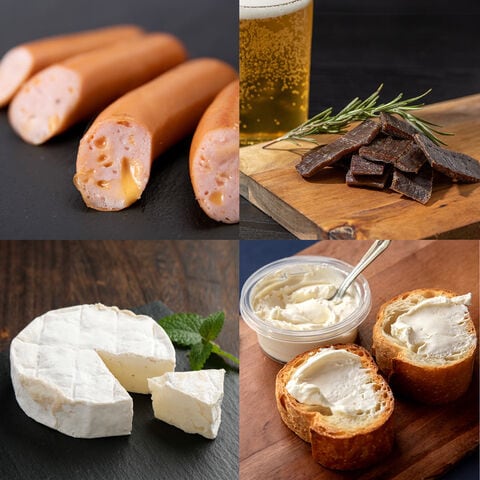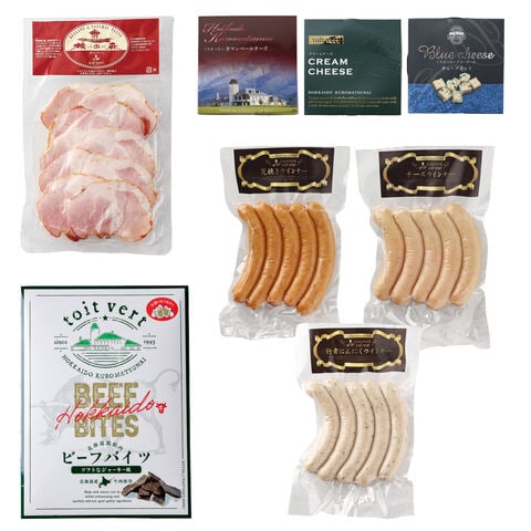 【数量・内容】荒挽きウインナー125g、行者にんにくウインナー125g、チーズウインナー125g、ボンレスハムスライス125g、くろまつないブルーチーズキューブカット50g、くろまつないカマンベールチーズ120g、クリームチーズ100g、ビーフバイツ70g