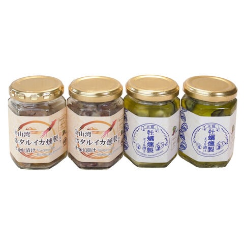 【数量・内容】富山湾ホタルイカ燻製オイル漬け111g(固形量50g)、北陸牡蠣燻製オイル漬け130g(固形量70g) 各2