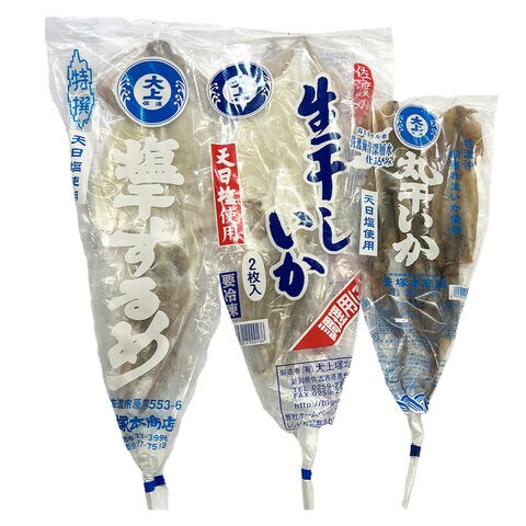 【数量・内容】塩干するめ約250g(2枚入)、生干しいか約250g(2枚入)、丸干いか約120g(3~4本入)