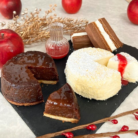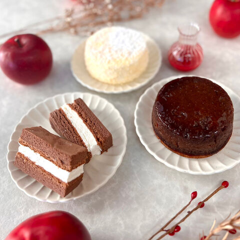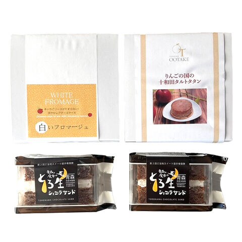 【数量・内容】りんごの国の十和田タルトタタン約310g×1、白いフロマージュ(ケーキ約220g、木苺ソース50g)×1、青森の魔女のとろ生ショコラサンド50g×2