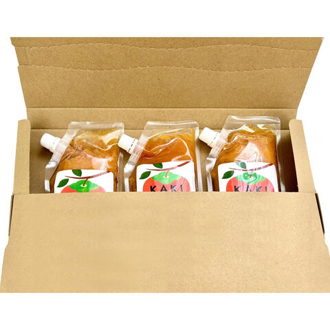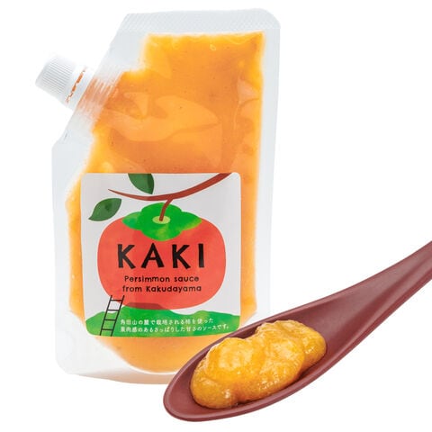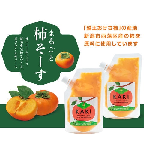 『越王(こしわ)おけさ柿』の産地で知られる、新潟市西蒲区の角田山(かくだやま)の麓で収穫した渋柿を使用した「まるごと柿ソース」です。渋柿は熱を加えると渋戻りしてしまうため加工品はほとんどありませんが、「柿そーす」では渋戻りを防ぐことに成功し、柿そのものの甘さを生かした低糖度のソースに仕上げています。原料には、ちょっとしたキズがある、形が悪い、といった規格外の柿を使用し、食品ロス削減にも取り組んでいます。本品は、buyer’s room AWARD 2023において全国商工会連合賞を受賞した「まるごと柿そーす」(瓶タイプ)のスパウトパウチタイプです。
