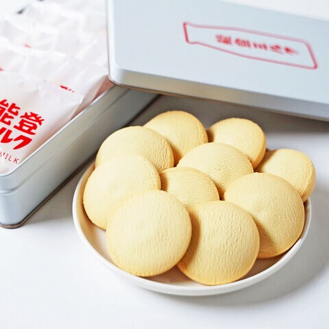 「能登ミルク 缶入クッキー ミルク」は、能登ミルク、珠洲の塩、国産小麦、てんさい糖、なたね油を使用した、素材にこだわった優しい風味のクッキーです。能登ミルクは、能登半島の大自然から生まれた、こだわりの牛乳です。”余計なものはなにも使わない”をコンセプトに、能登半島の限定酪農家たちが遺伝子組み換えしていない飼料を与え、能登の自然の中で育てた乳牛の生乳を使用しています。
