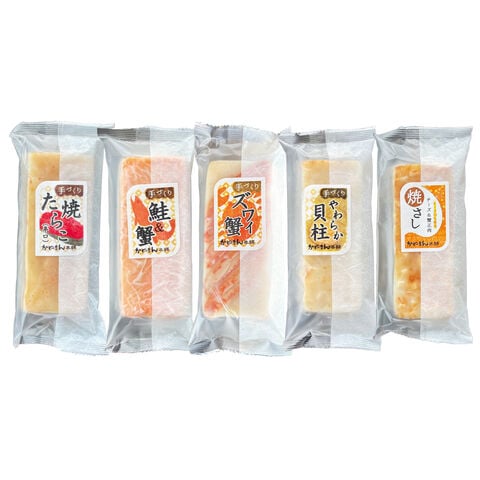 かねまん本舗 創作かまぼこ シーフードケーキ 食べ比べ 5種セット 焼たらこ ズワイ蟹 貝柱 ほか 蒲鉾 詰め合わせ 練り物 魚肉 すり身 ズワイガニ ほぐし身