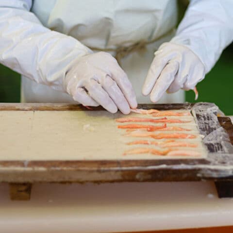 <鮭&蟹>魚肉(ミナミダラ(ニュージーランド)、グチ)、鮭、ベニズワイガニ(ほぐし身)、でん粉(小麦を含む)、砂糖、本みりん、食塩/トレハロース、調味料(アミノ酸等)、香料、大豆粉、乳化剤