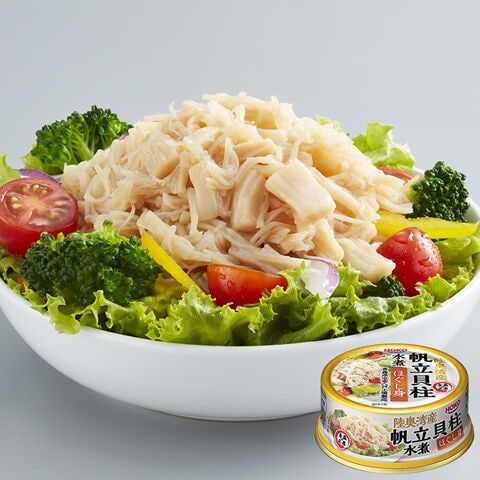 青森県の陸奥湾で水揚げされた帆立を使用した「陸奥湾産 帆立 貝柱 ほぐし身 缶詰」です。帆立の貝柱には、旨み成分のグリコーゲンがたっぷり含まれています。貝柱は身が繊維状でほぐれやすく、「ほぐれている」というだけで安くなっています。帆立貝柱のホールタイプは、生・冷凍・缶詰のいずれも高級品ですが、ほぐし身であっても、味などは何も変わりません。身がほぐれただけの「ほぐし身」は断然お得にお買い求めいただけます。おつまみとしてそのままお召し上がりいただくほか、さまざまなお料理の具材としてご使用いただけます。