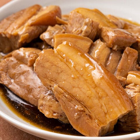 【原材料】豚バラ肉(輸入)、糖類(砂糖、水あめ)、しょうゆ、食塩水、おろし生姜/pH調整剤、調味料(アミノ酸等)、増粘剤(キサンタンガム)、リン酸塩(Na)、カラメル色素、(一部に小麦・豚肉・大豆を含む)