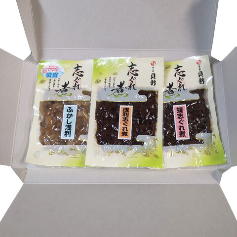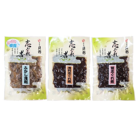 【数量・内容】浅利志ぐれ煮65g、ふかし浅利75g、蜆志ぐれ煮85g